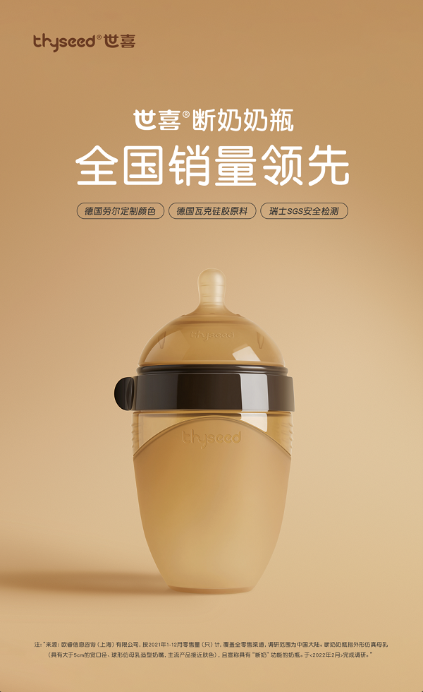 专业的断奶奶瓶对于断奶期家庭来说,无异于“断奶神器”。世喜基于对断奶期宝宝不同需求的精准洞察,通过近肤“世喜棕”、超软硅胶、仿真大奶嘴,三个创新亮点,推出了世喜大棕瓶。近肤“世喜棕”由全球标准色彩定义者德国劳尔专属定制,为婴幼儿带来具有安全感的颜色;超软硅胶由全球领先有机硅制造商德国瓦克战略定制,更接近于肌肤的软度;而世喜大棕瓶的奶嘴口径也明显比市面其他奶瓶要大,其大小和饱满的弧度也能混淆宝宝的判断;再加上奶嘴上的乳晕凸起设计,正是仿母乳特性的最佳助力点。
